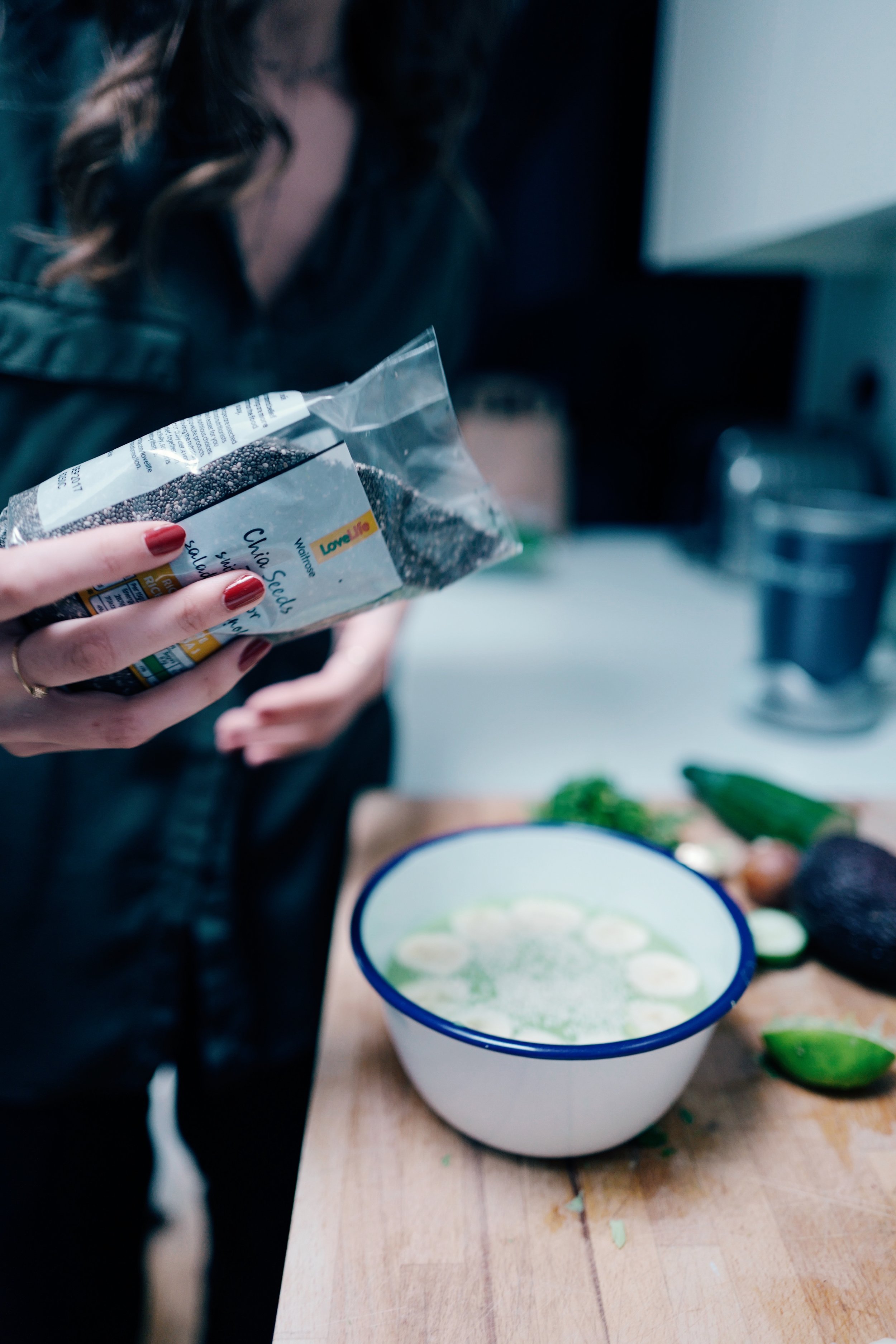 Cortar tudo aos bocadinhos e triturar numa liquidificadora. Eu utilizo a Nutri bullet, se não tens uma deixa-me que te diga que é super útil e prática, utilizo-a quase todos os dias para fazer smoothies, sopas, molhos, etc. Depois de triturado despeja a mistura para uma tigela, corta uma banana às rodelas para decorar o smoothie e polvilha-o com sementes de chia. Bon appetite! Chope everything and blend it. I use a Nutri bullet, if you don't have one yet you better sort that out. It's super practical and, nowadays, fundamental in my kitchen, I use it everyday for smoothies, soups, sauces, etc. Pour the misture into a bowl, slice a banana to decorate your smoothie and sprinkle it with chia seeds. Enjoy!